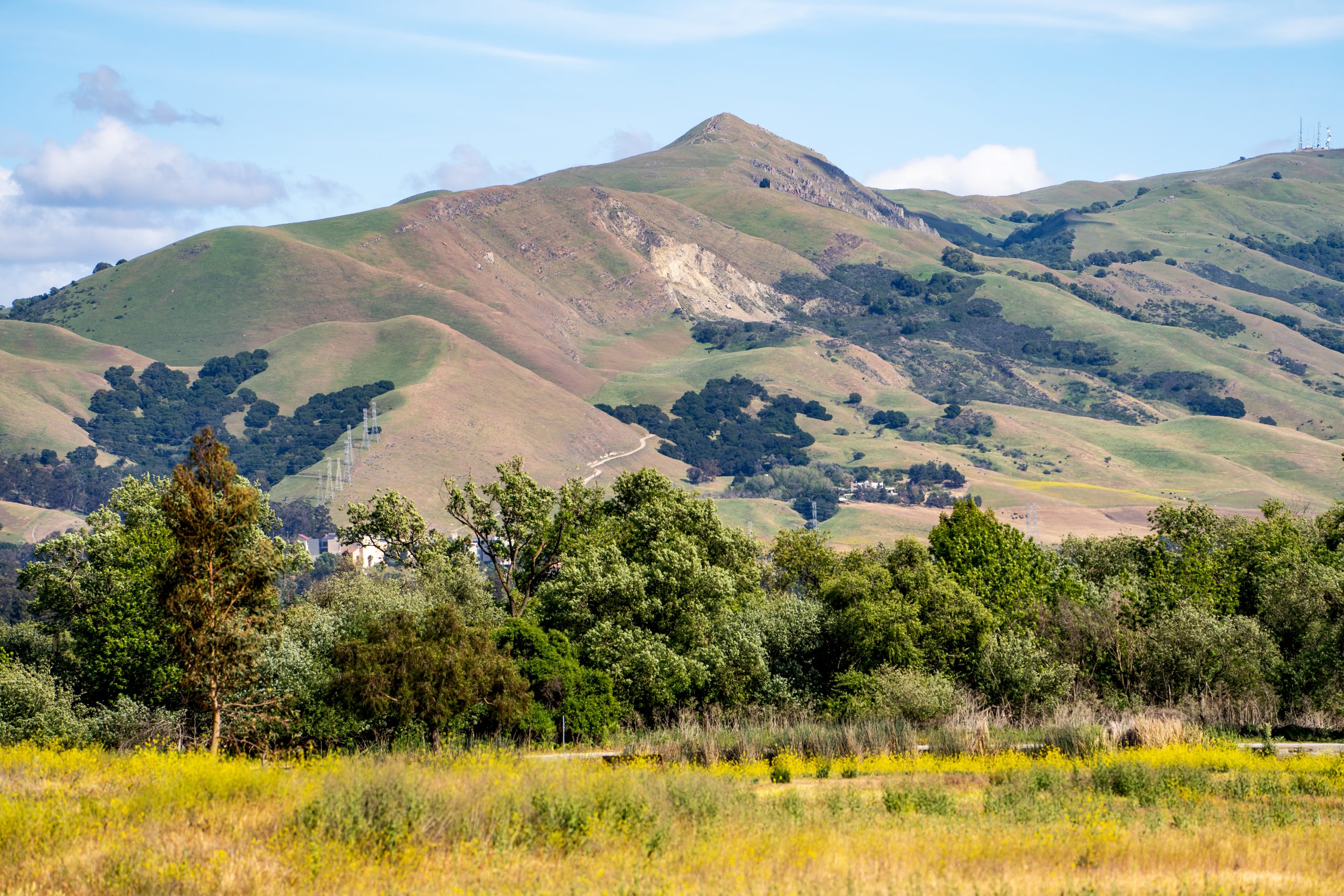 Rising steeply to the east behind the city of Fremont, Mission and Monument peaks form a dramatic backdrop to the South Bay, part of the East Bay Regional Park District,