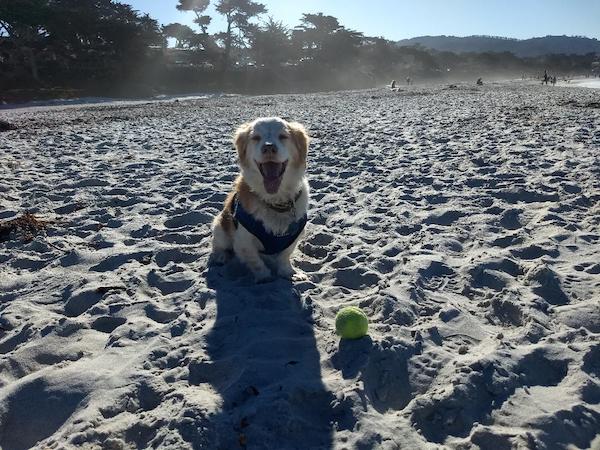 This California experience is in my backyard (haha). There is another pic attached of Huntley in Carmel. Backyard deck dogs left to right Peyton, Huntley, Sammie, Torrie and Finn. The 2nd picture is Huntley at Carmel beach loving his ball time and just Carmel in general. I have family there so visit often.