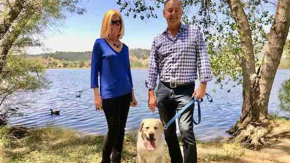 An adventure-loving couple is standing alongside a serene lake as radiant sunlight gently wraps around them. At their side, their faithful golden retriever eagerly awaits the possibility of a shared experience, with his intelligent eyes gleaming with anticipation. It is indeed the perfect day for dog-friendly excursions and bonding moments under nature’s blue expanse. – Dogtrekker